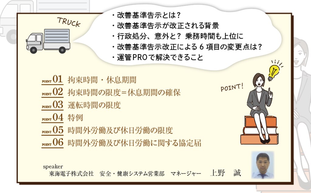 2024年4月からの改善基準告示の変更点と東海電子の【運管PRO】で解決できることをお伝えいたします。